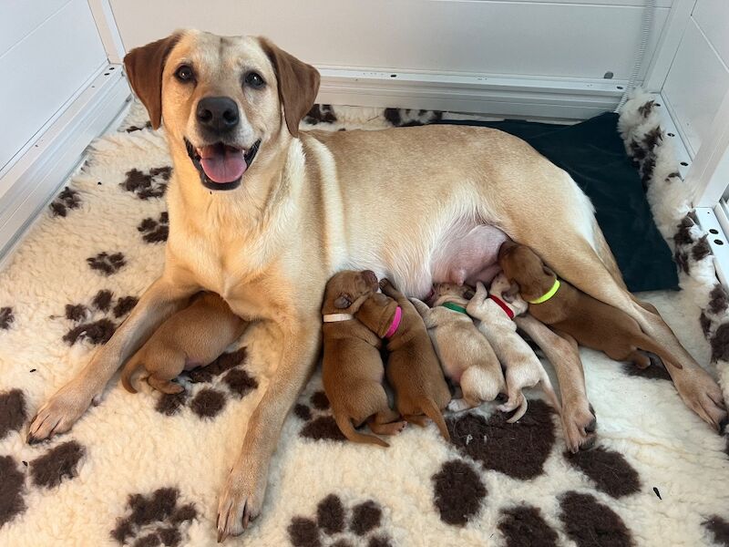 Our working Labrador Amber has just had her litter of puppies. 1 fox red girl & 6 boys of which 3 are a deep fox red, and 3 a lighter shade of yellow